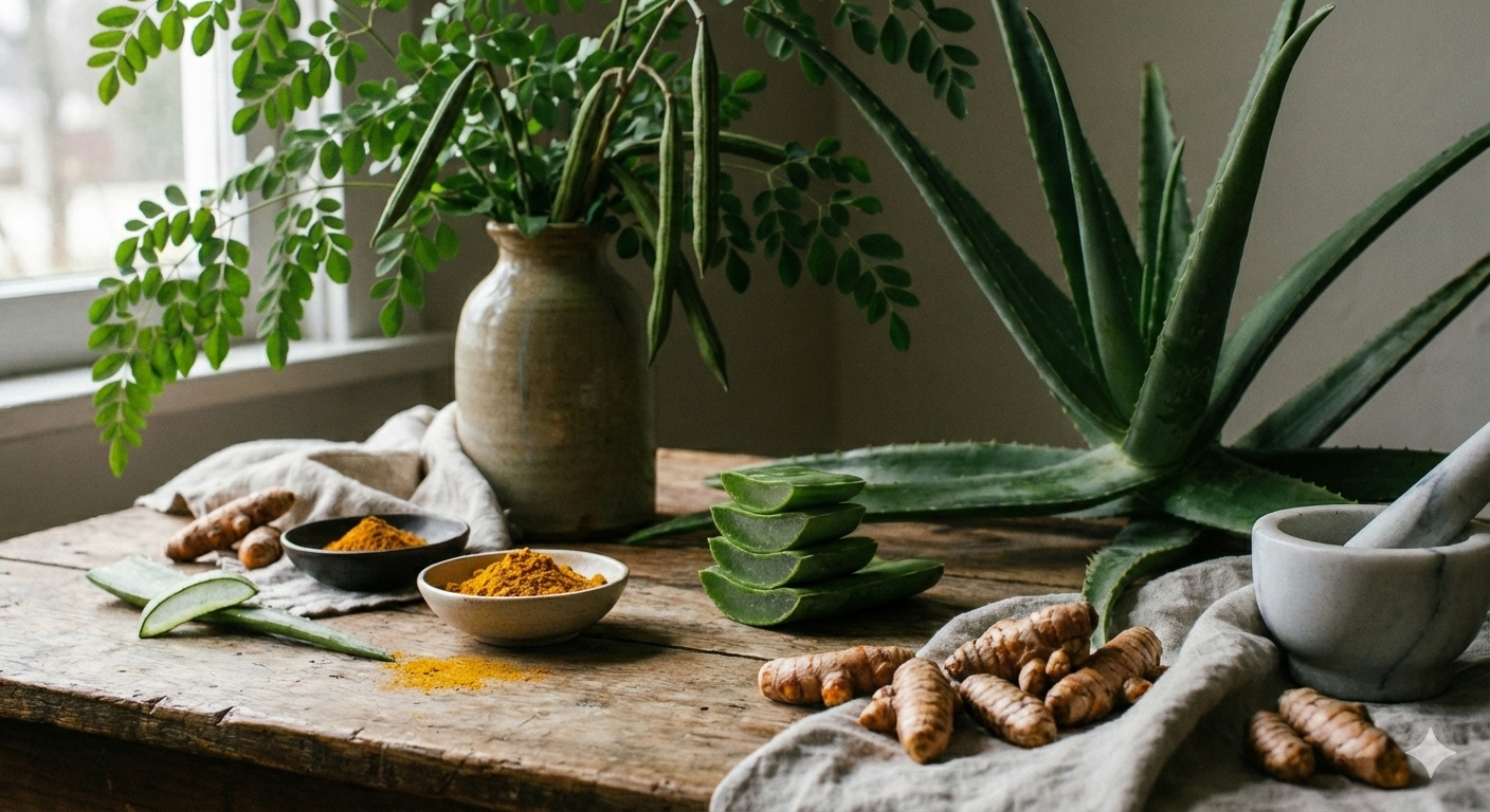 - Indian botanicals like moringa thoughtfully combined with modern actives